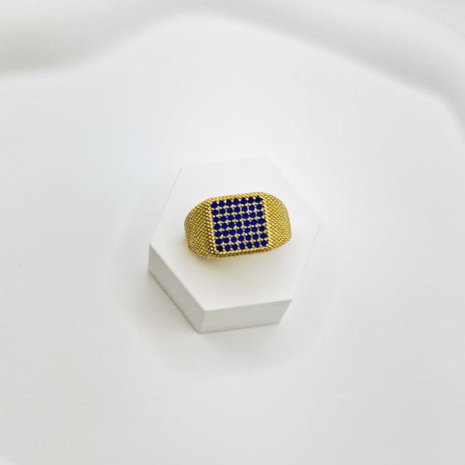 bold gold ring paved with deep blue stones in a striking grid pattern