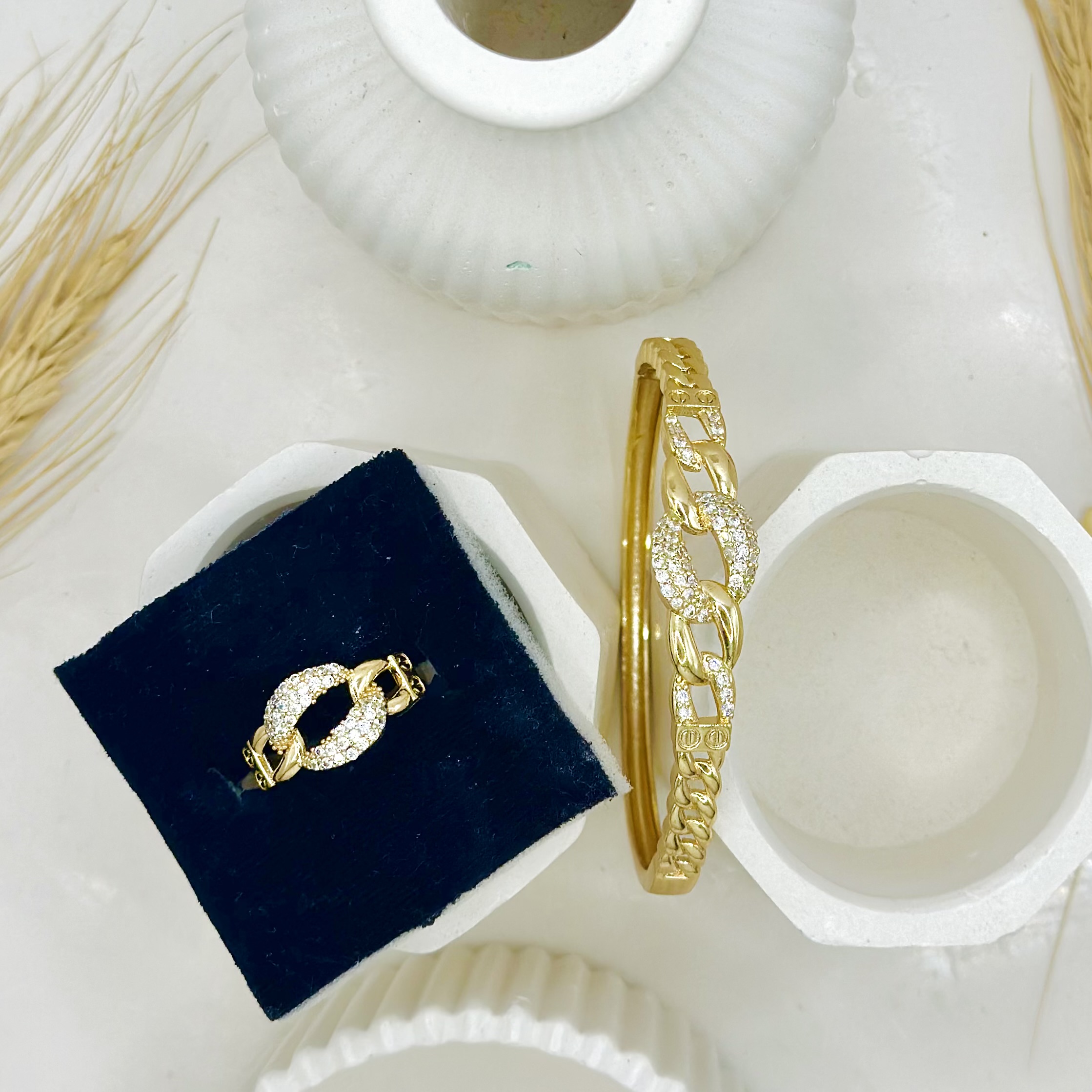 Linked Luxe Is a golden set of ring and bracelet with dazzling stones